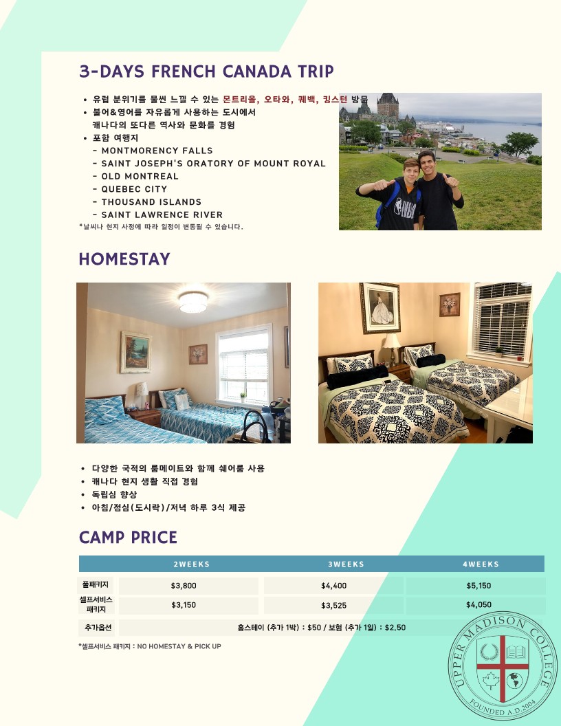Âü°¡ºñ: 2ÁÖ $3800/ 3ÁÖ $4400 / 4ÁÖ $5150 (CAD, Ç®ÆÐŰÁö ±âÁØ)
